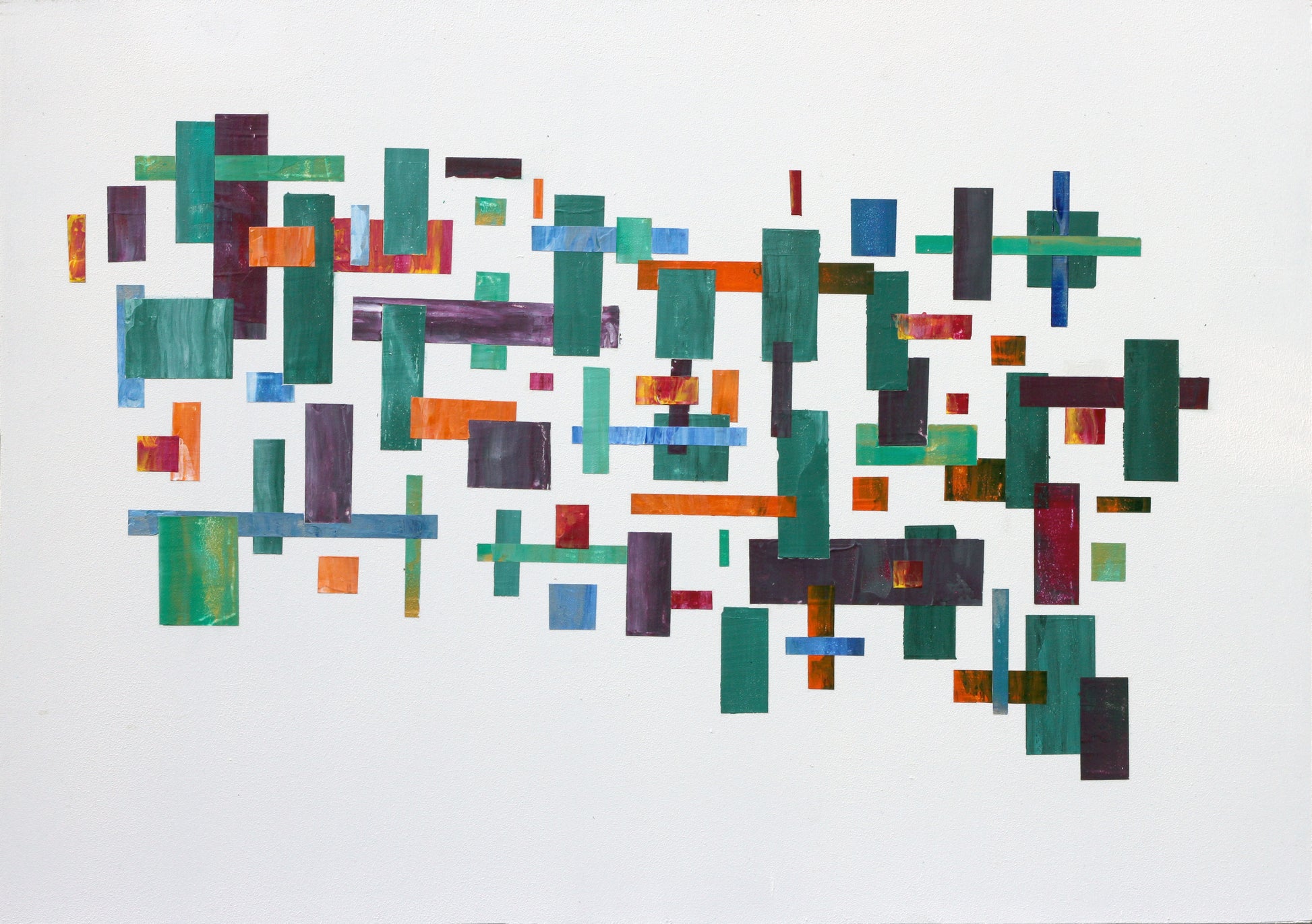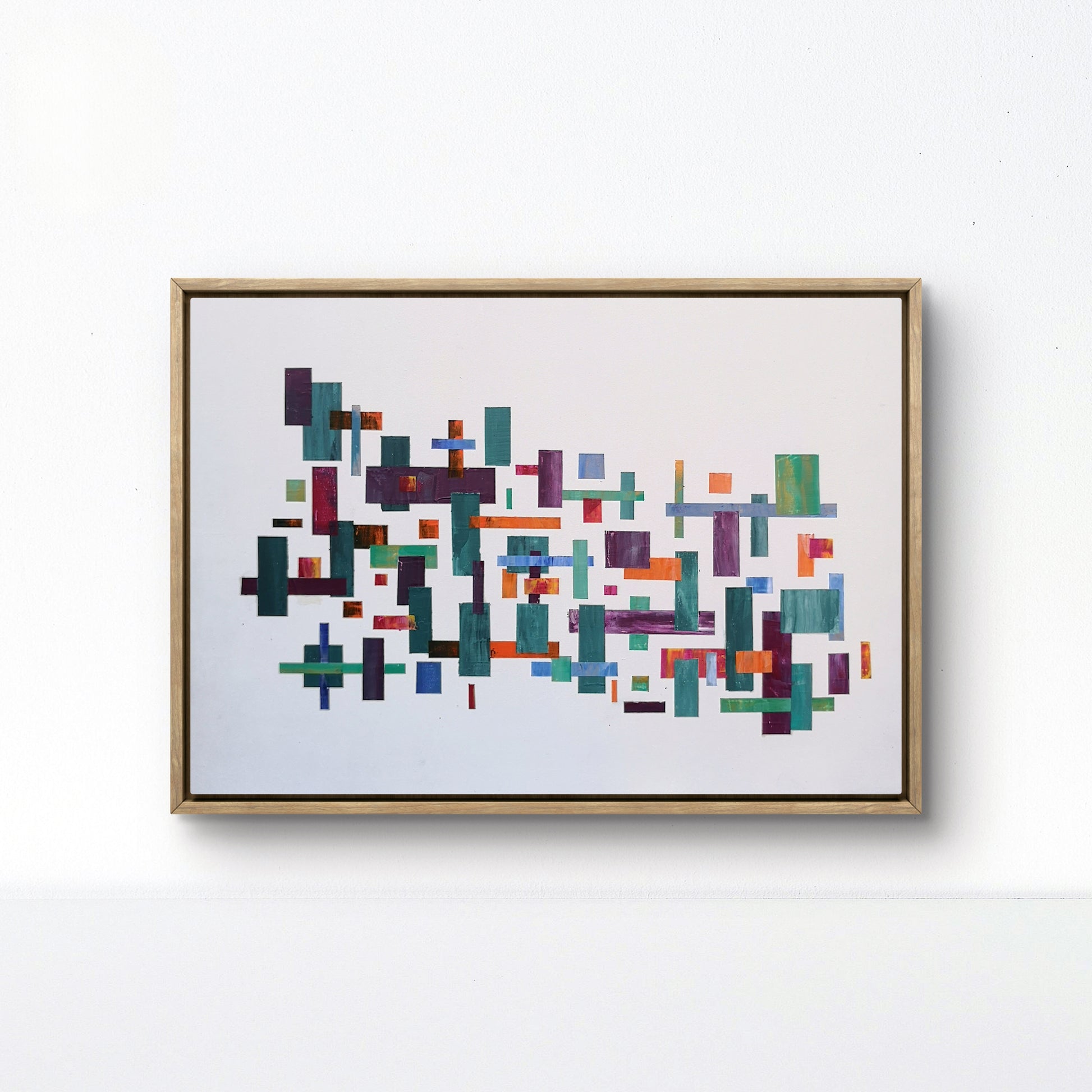 'Intersecting Moments' A controlled explosion of colour and form, Intersecting Moments explores the delicate balance between structure and spontaneity. Individually masked and painted with a palette knife, each rectangle carries its own texture, rhythm, and imperfect edge.