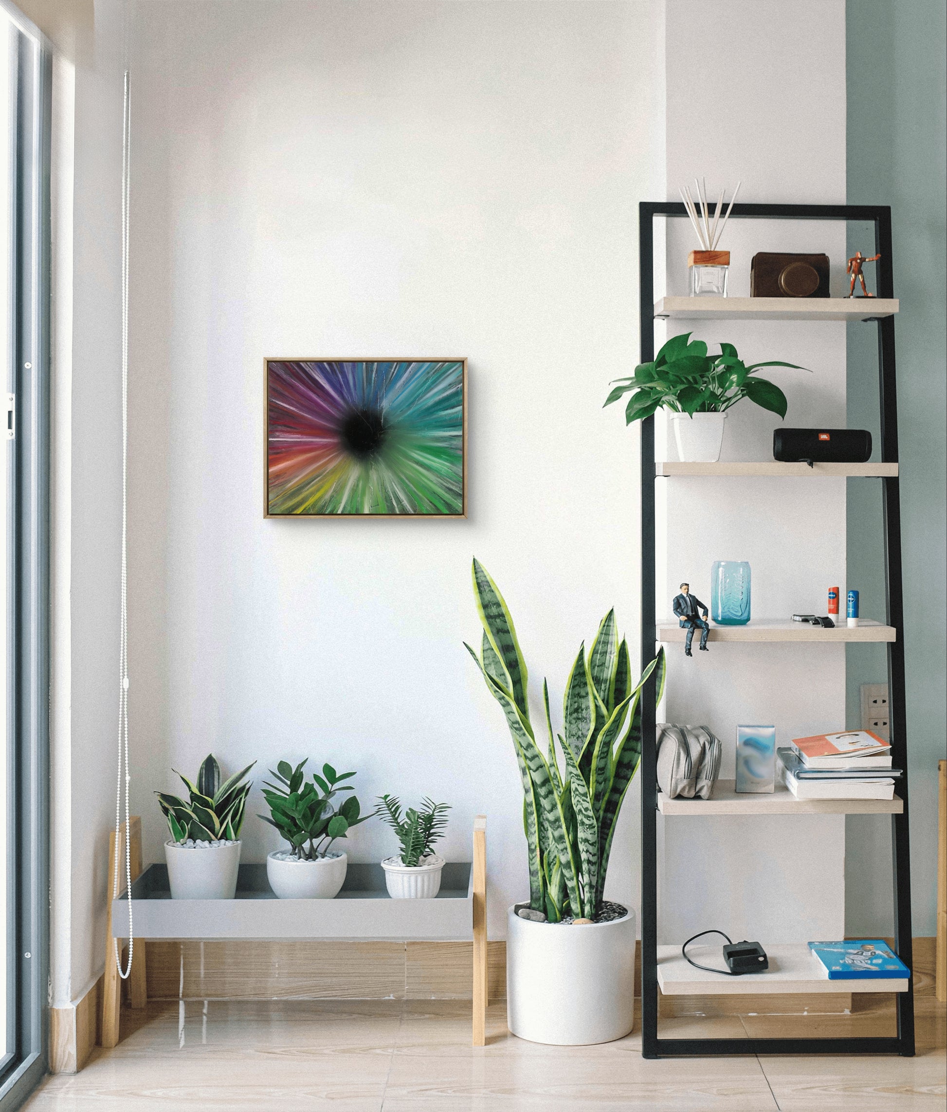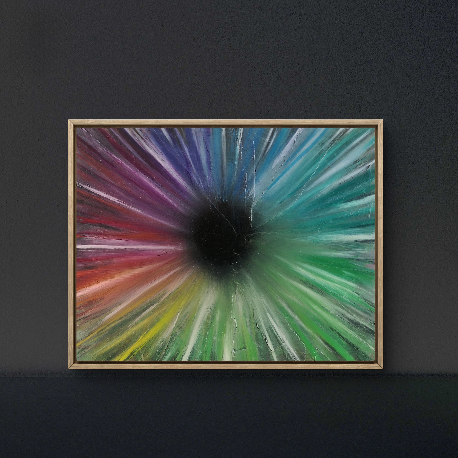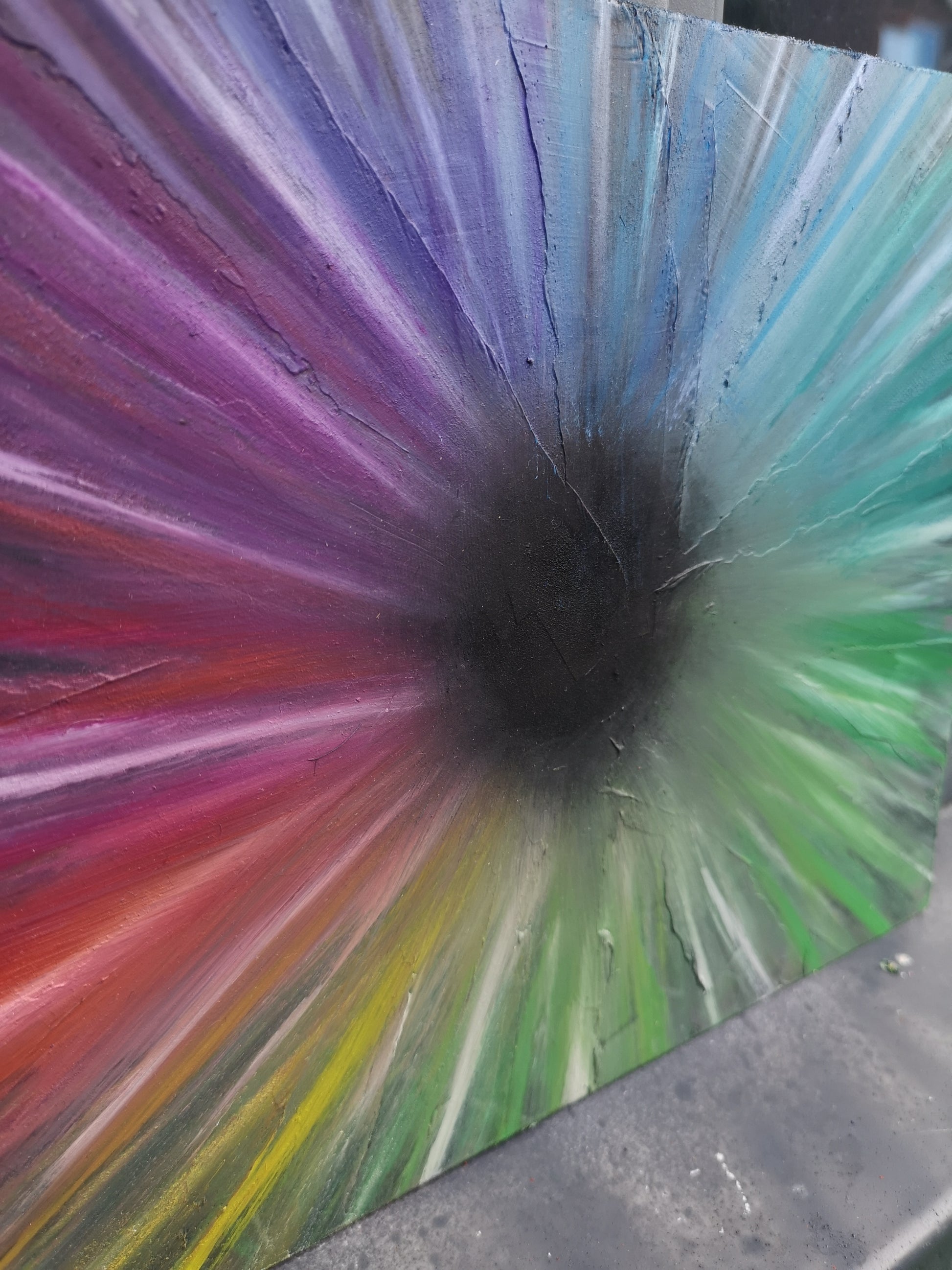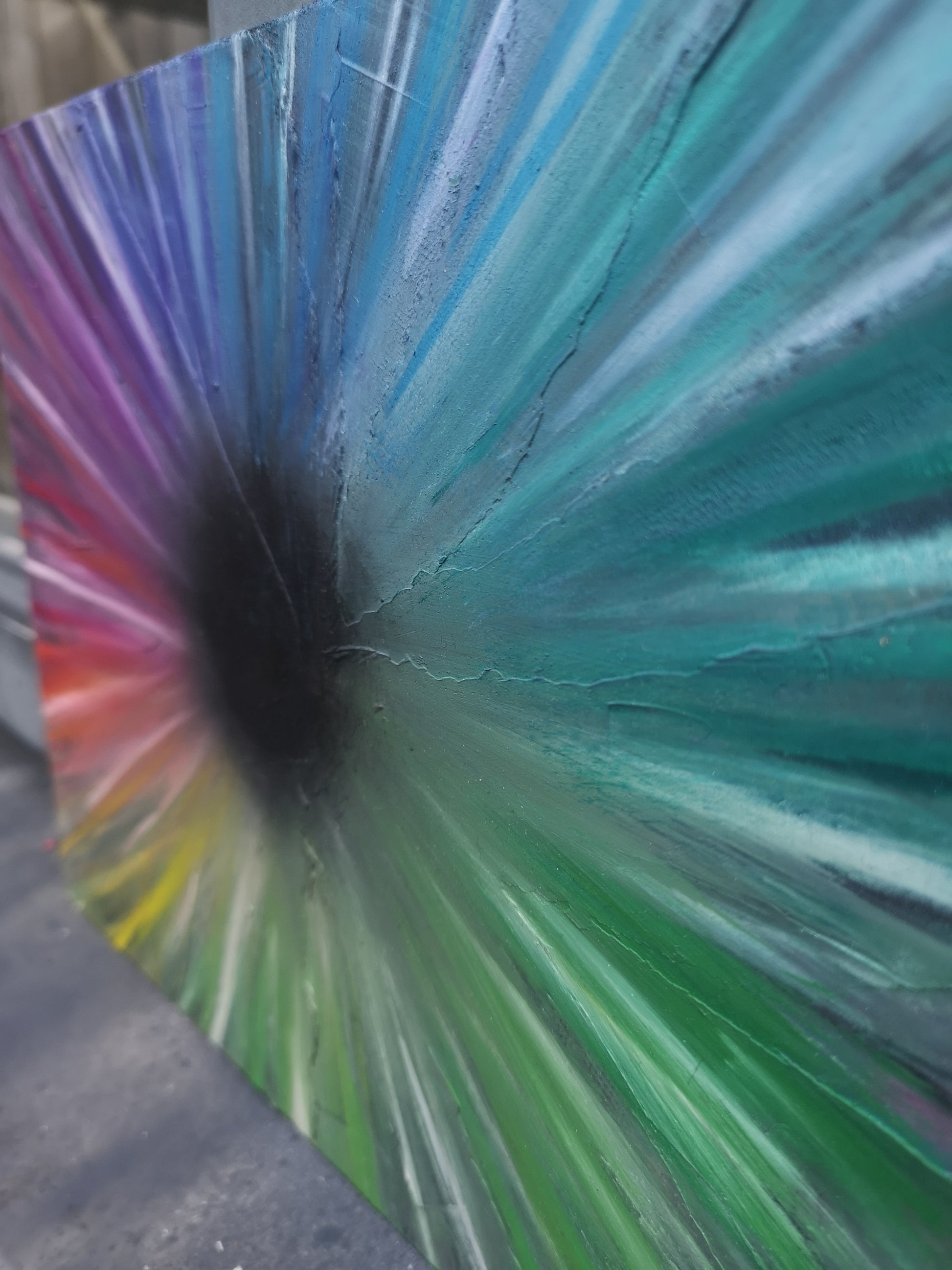 'Out of the Darkness" is an abstract representation of liberation and transformation. At its core, deep black evokes the overwhelming gravity of a black hole, pulling everything into its void. As the piece radiates outward, these dark tones fracture and give way to bursts of vibrant color—fiery oranges, bright yellows, and electric blues—symbolizing the escape of light and energy. The dark center explodes into bright and light colours suggesting a journey from confinement to freedom, from darkness to light.