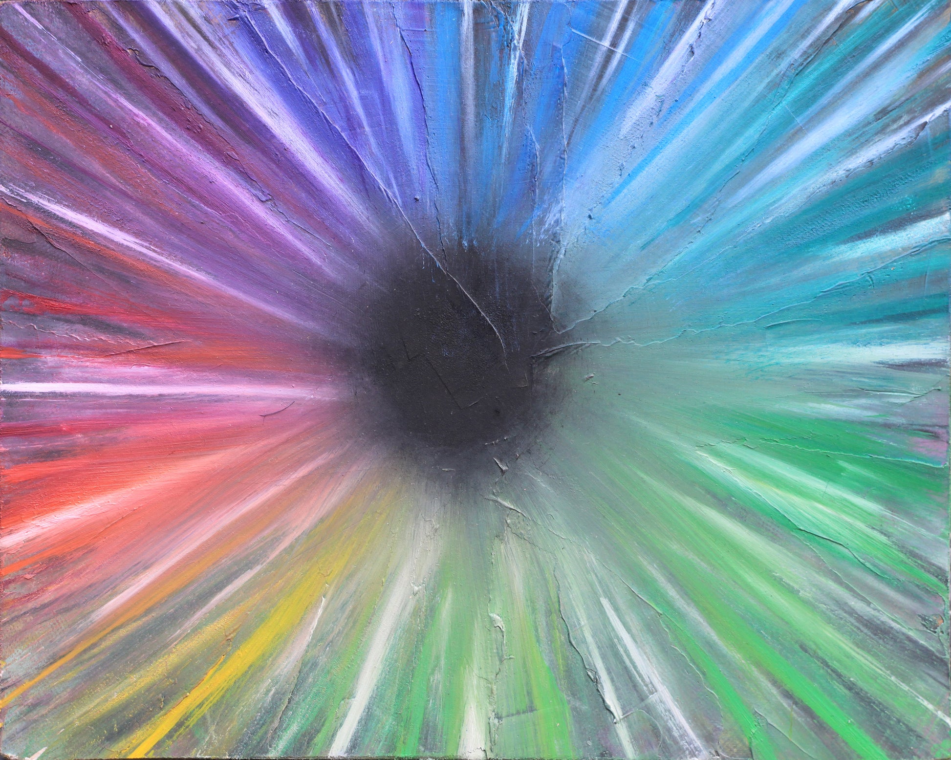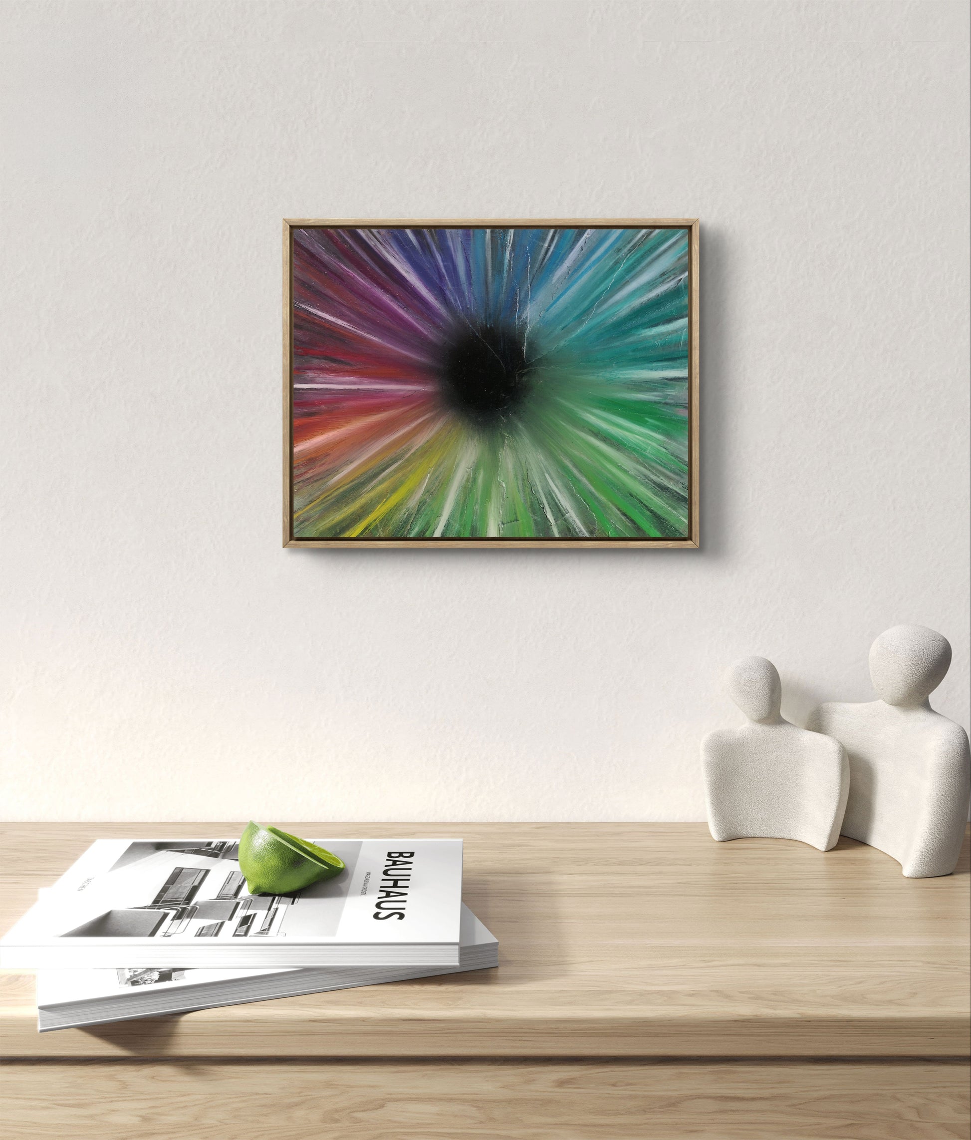 Painted oil on board this piece combines dark black centre with vivid bright colours with a gloss varnished finish. This is a small piece with bold and consuming feel. Framed in either white or black floating style frame.